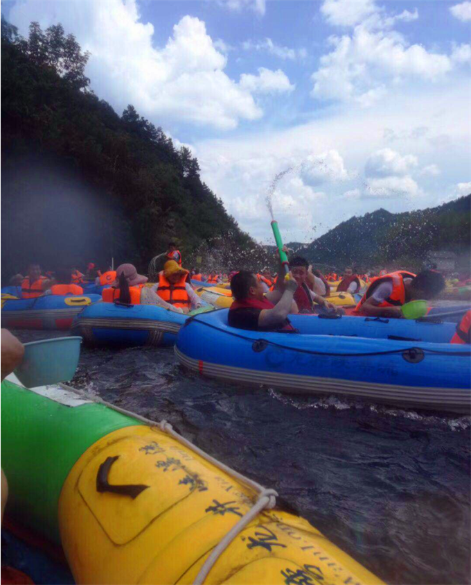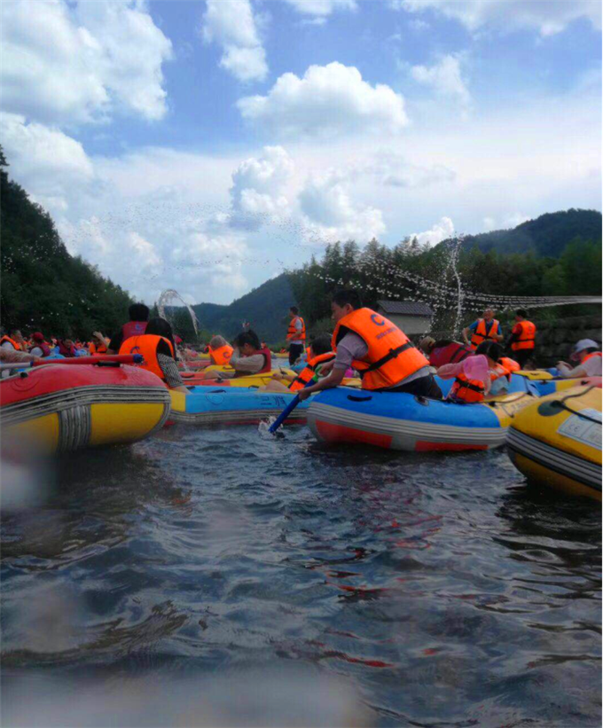 吃完中午飯后,乘著旅游大巴終于抵達(dá)期待已久的目的地龍井峽漂流,大家迫不及待地穿戴好救生衣帽,跳上皮筏艇,一艘艘皮筏艇,隨著激流飄蕩、回旋,整個(gè)過程充滿了驚、奇、險(xiǎn)的樂趣。皮筏艇漂到平處時(shí),同事們紛紛玩起了水仗,水仗的武器有水槍、水瓢等等。水槍適合長(zhǎng)距離噴射,當(dāng)敵我有一定距離時(shí),選用水槍,朝對(duì)方眼睛攻擊,定能將對(duì)方打得個(gè)措手不及;若敵我距離近,可選用水瓢,舀起水拼命往對(duì)方臉上頭上潑,然后乘勝漂走……一時(shí)局面陷入混戰(zhàn),水浪滔天,喧鬧的水聲笑聲不絕于耳,分不清敵我?;蛟S我們都擁有一顆未泯的童心,拋開煩惱壓力,放下所有的束縛,擁抱大自然,心中被快樂充滿,童性在這一刻釋放,此刻的我們仿佛一群調(diào)皮的孩童,恣意享受這短暫的快樂。