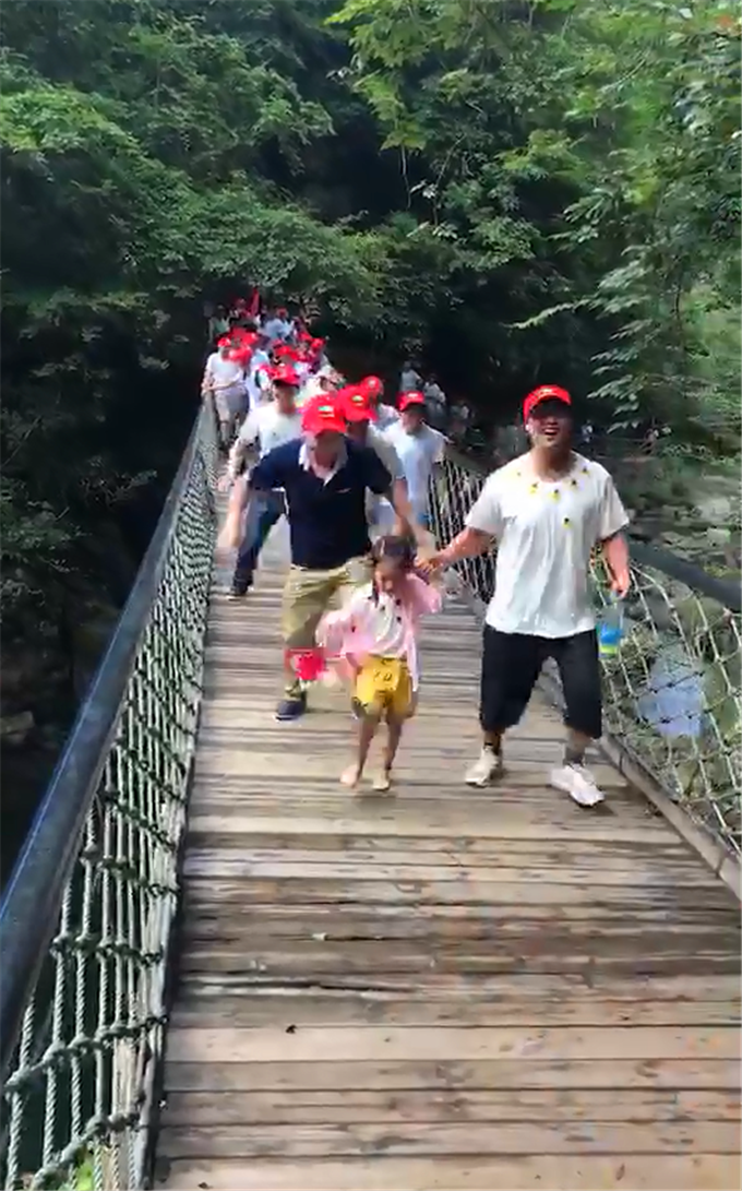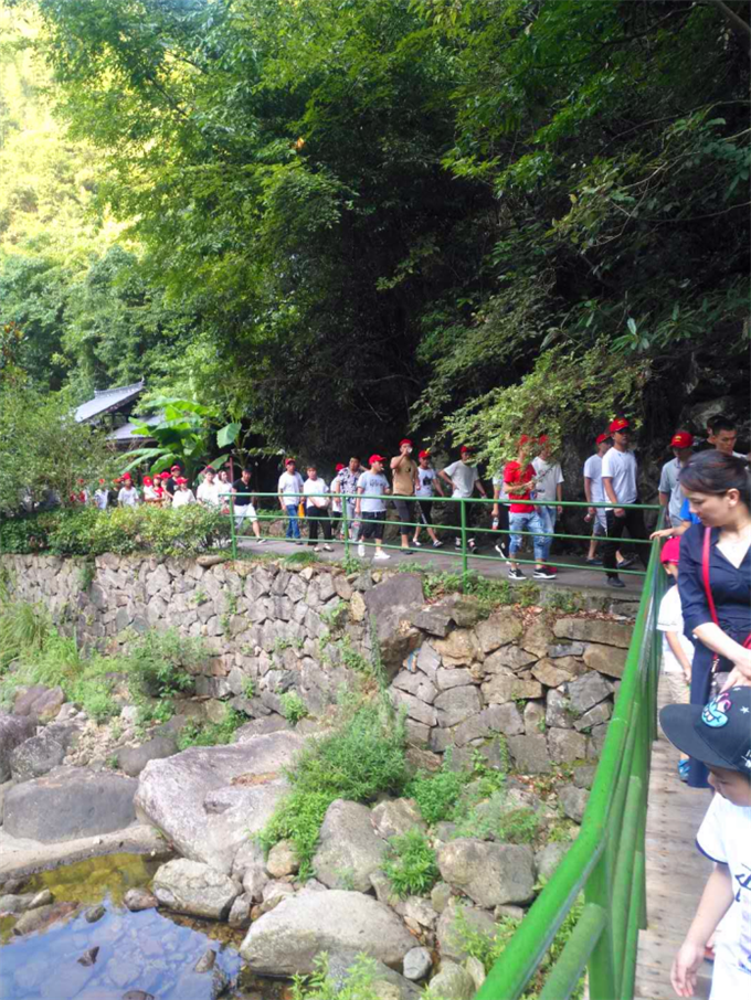 第二天清晨,清香裊裊,讓人心曠神怡,帶著興奮而激動(dòng)的心情開啟了我們新的旅程—華東第?旅游峽谷 · 浙西?峽谷,峽谷境內(nèi)?高水急,峽谷全長(zhǎng)83公里,已開發(fā)的18公里內(nèi)分四個(gè)游覽區(qū),分別為柘林瀑、劍門關(guān)、老碓溪、白馬崖景區(qū),游覽區(qū)內(nèi)主要景觀點(diǎn)有草屋、雙板橋、鯉魚石、炎生潭、?攀巖、咚咚石、龍門潭、登?石階、望景亭、溜?滑梯等。來到浙西?峽谷,大家觀賞著這一路的風(fēng)景:藍(lán)天、白云、綠樹、流水、瀑布,?峽谷果然如詩(shī)如畫般壯美幽深,行走在景區(qū)里的吊橋上,童心大開的同事們晃動(dòng)著吊橋,引得同事們大呼小叫,其樂融融;我非常欣賞的是景區(qū)的瀑布,那泄流而下,飛珠濺玉的姿態(tài),在陽(yáng)光下幻化出的色彩,讓人不由得聯(lián)想起古人的詩(shī)句—遙看瀑布掛前川,疑是銀河落九天。